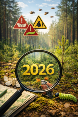 W prognozie na rok 2026 zwrócono uwagę na kilka najważniejszych czynników ryzyka związanych ze szkodnikami uszkadzającymi drzewa — zarówno w drzewostanach starszych, jak i na powierzchniach odnowieniowych.