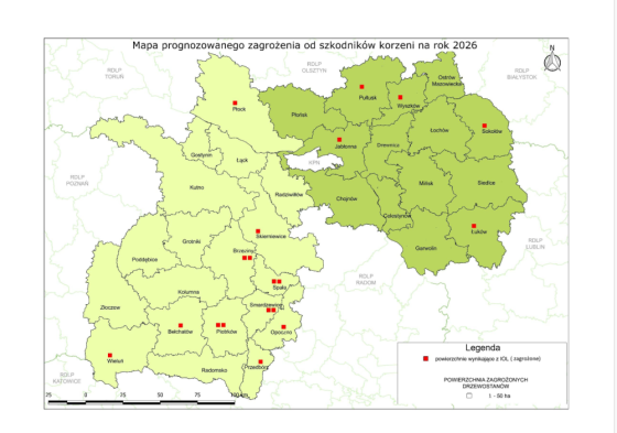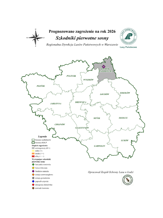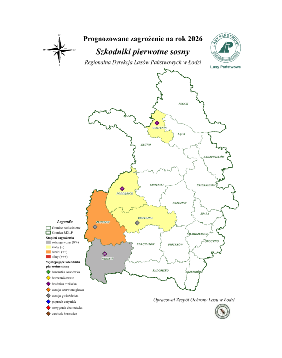 Dodatkowo wskazano ryzyko żerów osnui gwiaździstej w Nadleśnictwie Złoczew oraz Nadleśnictwie Kolumna obejmujące łącznie 75 ha drzewostanów sosnowych.