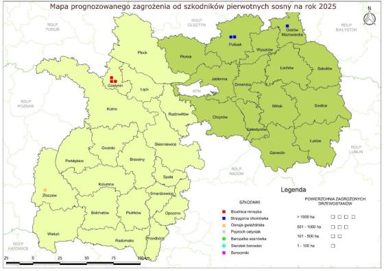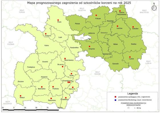 Na podstawie obserwacji prowadzanych co roku na terenie nadleśnictw oraz wykonanych badań, Zespół Ochrony Lasu w Łodzi przygotował prognozę zagrożenia drzewostanów na rok 2025. Stwierdzono zagrożenie ze strony Brudnicy mniszki w Nadleśnictwie Gostynin (RDLP Łódź) na łącznej powierzchni 1 000 ha. Na terenie RDLP Warszawa nie stwierdzono zagrożenia żerami tego owada. Drzewostany sosnowe w Nadleśnictwie Złoczew (RDLP Łódź) zagrożone są na łącznej powierzchni 50 ha żerami Osnui gwiaździstej.